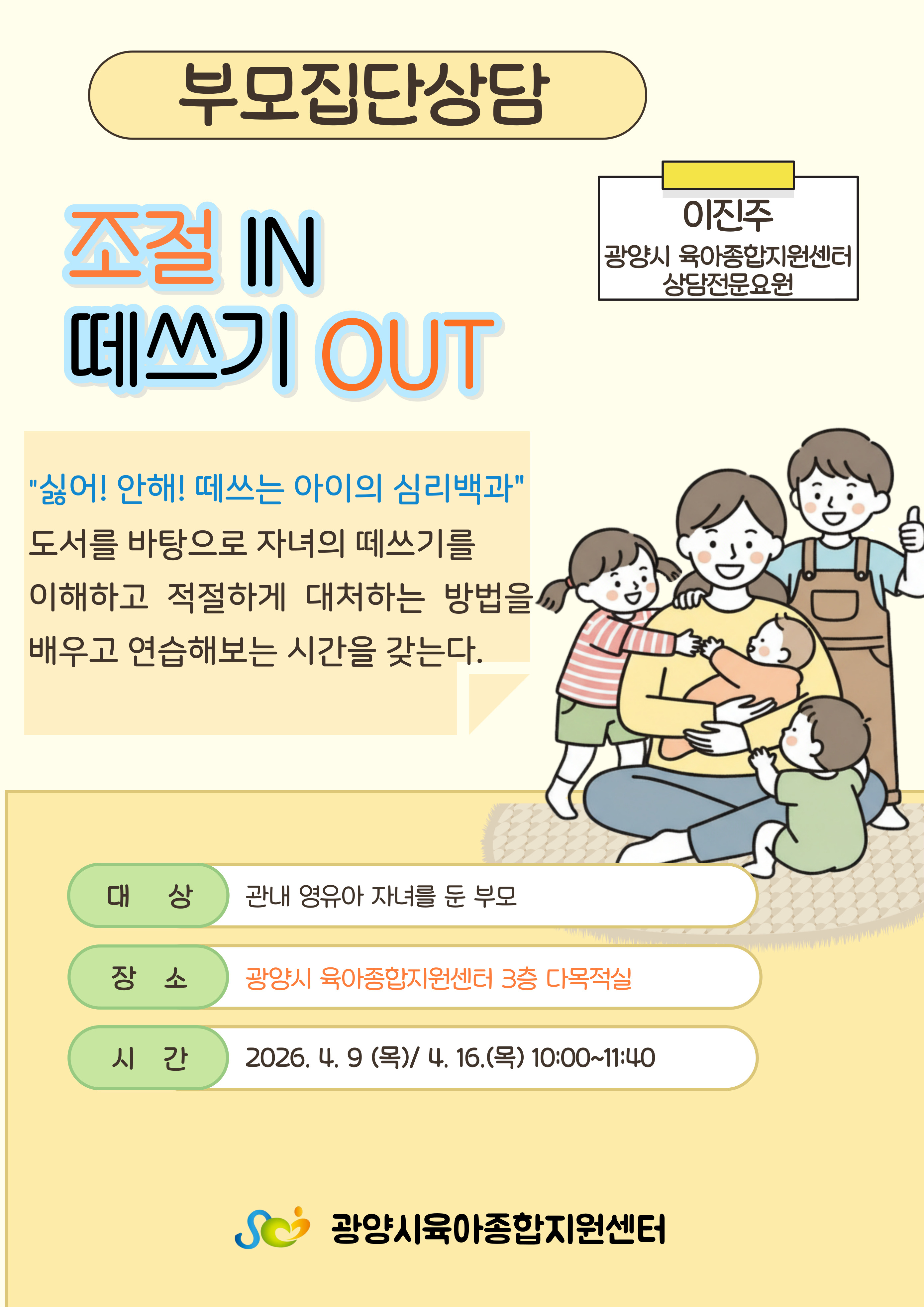 [부모] 부모집단상담: 조절 IN 떼쓰기 OUT(2회기-4/9,4/16)(10:00~11:40)